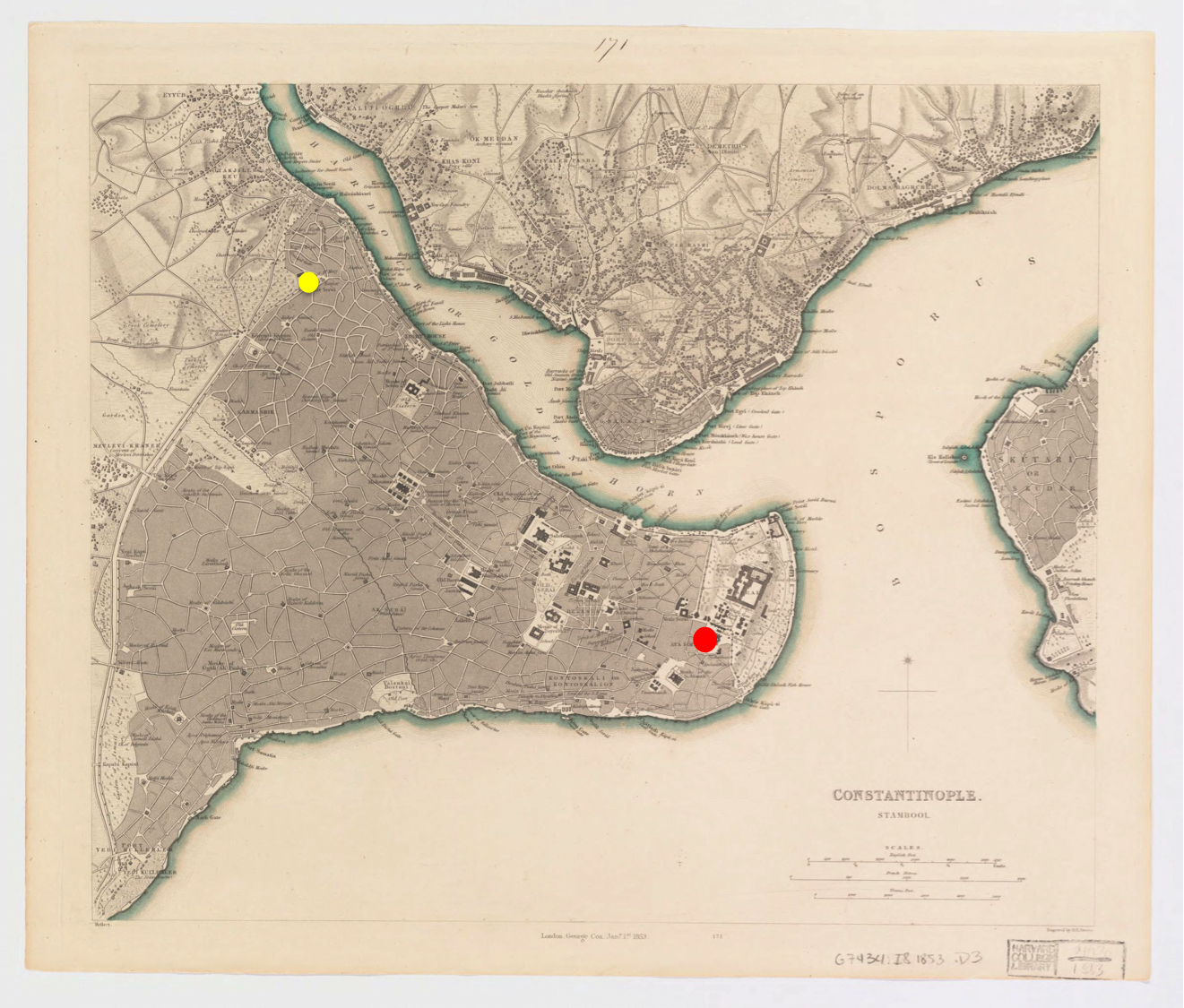 Map of Constantinople with locations of the Great Palace and the Palace of Blachernae highlighted