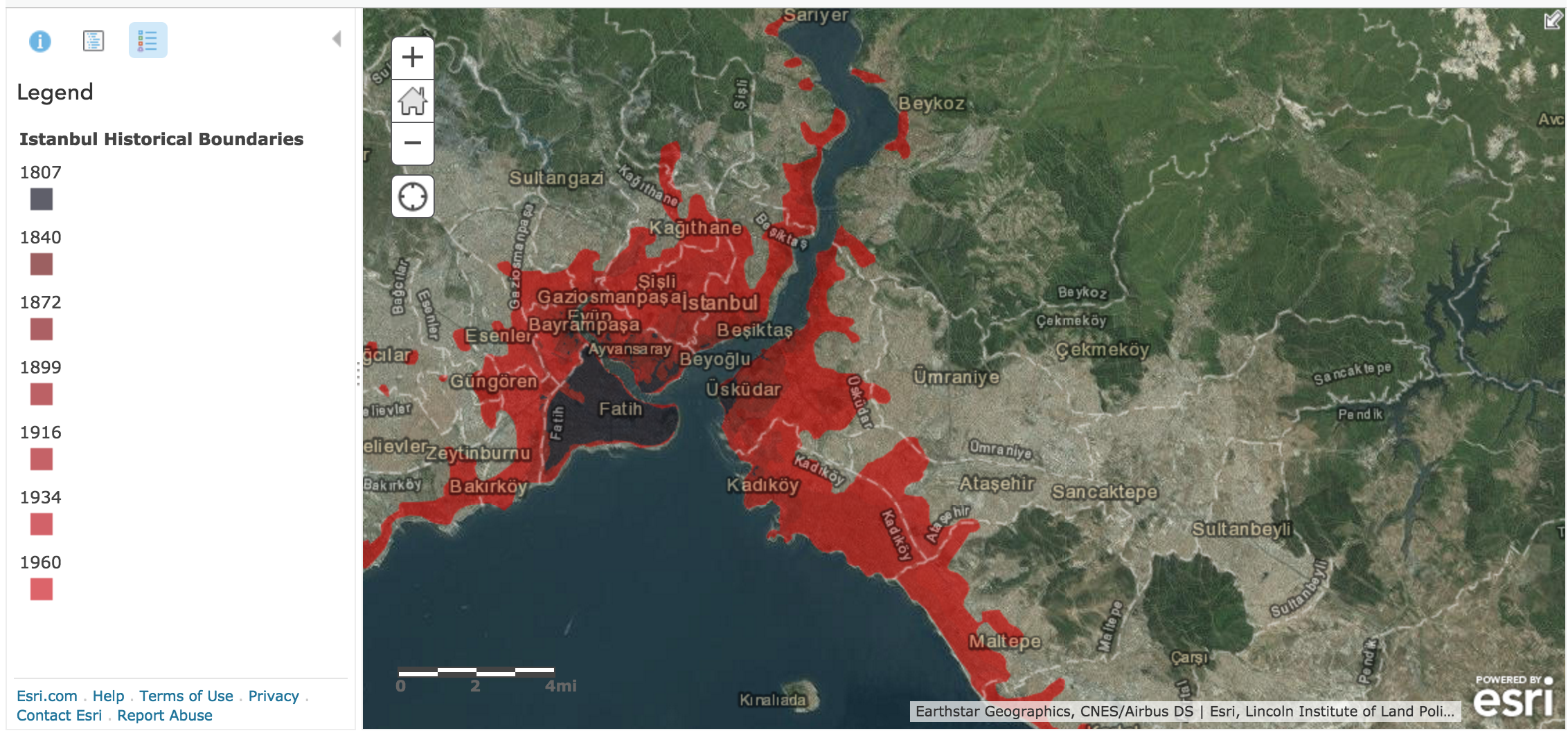 This map shows the historical boundaries of the city. We can see how the city has from 1807 (mostly within the Theodosian Walls) to 1960 (almost the size of modern day Istanbul).