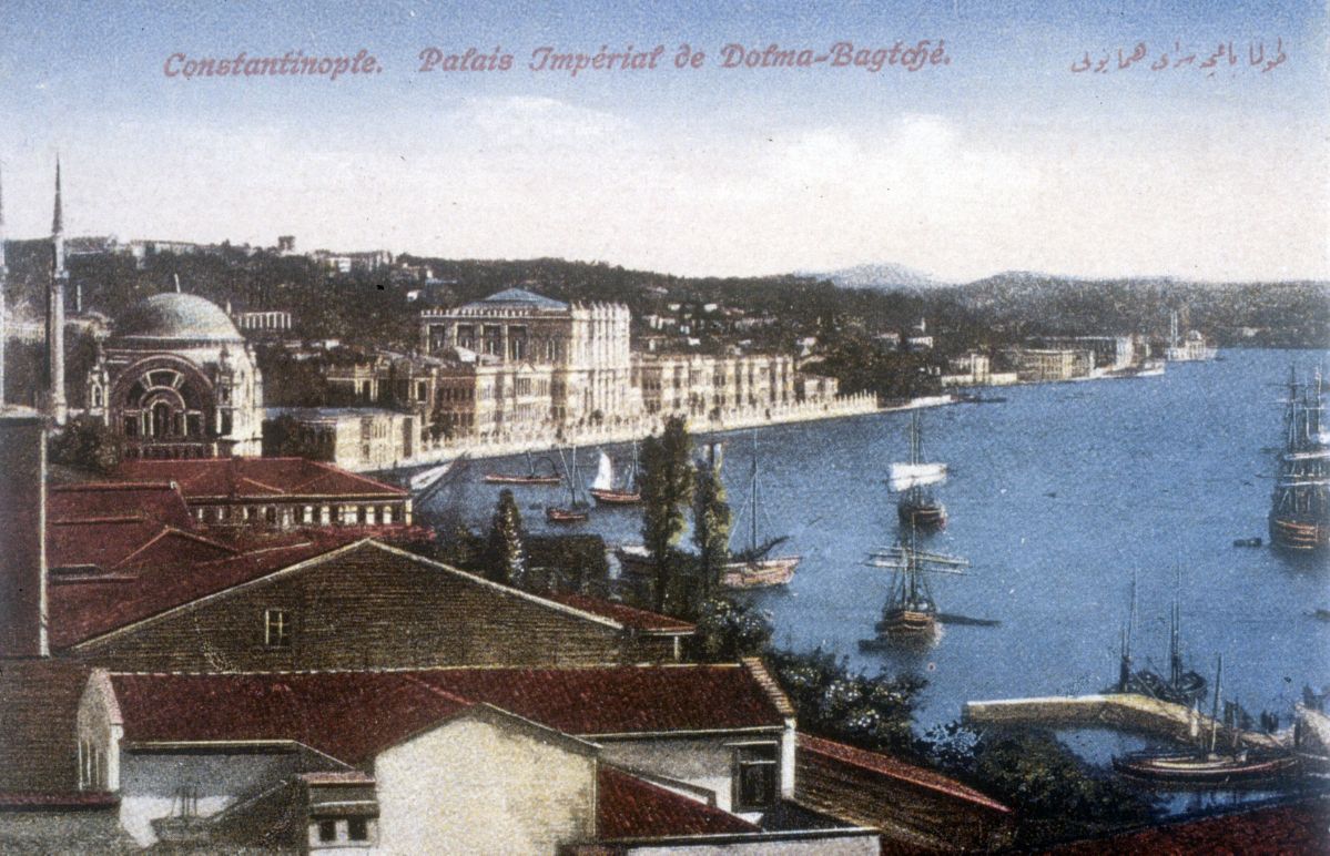 An old postcard of Constantinople featuring the Dolmabahce Palace