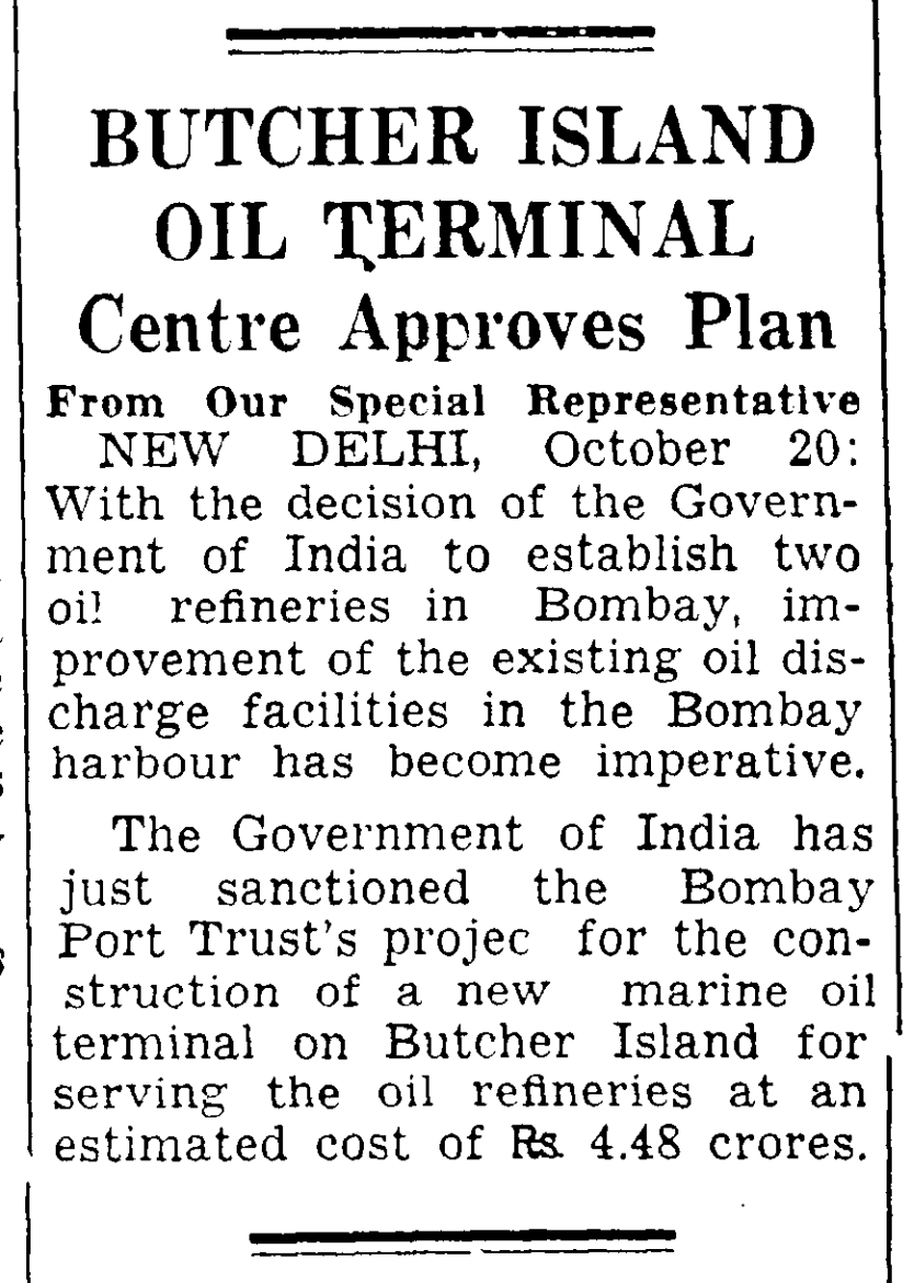 Announcement: "The Government of India has just sanctioned the Bombay Port Trust's project for the construction of a new marine oil terminal on Butcher Island for serving the oil refineries at an estimated cost of Rs. 4.48 crores."