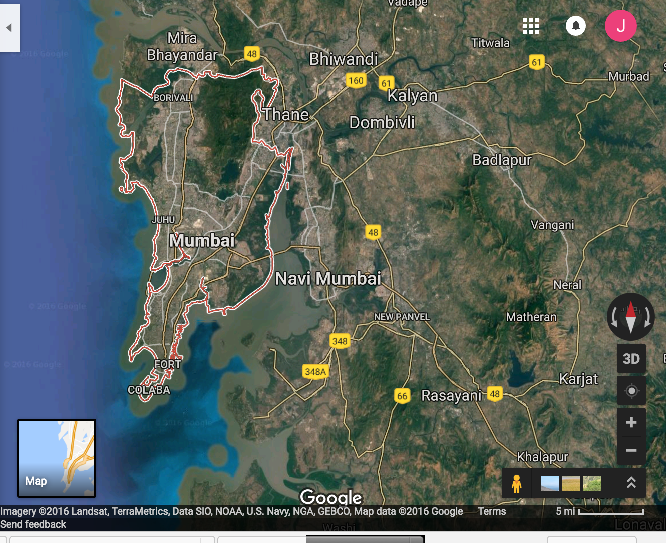 Modern-day Mumbai is not only continuous, not all resembling the seven original islands, but is also attached to the mainland of India. This map was taken using Google Maps.