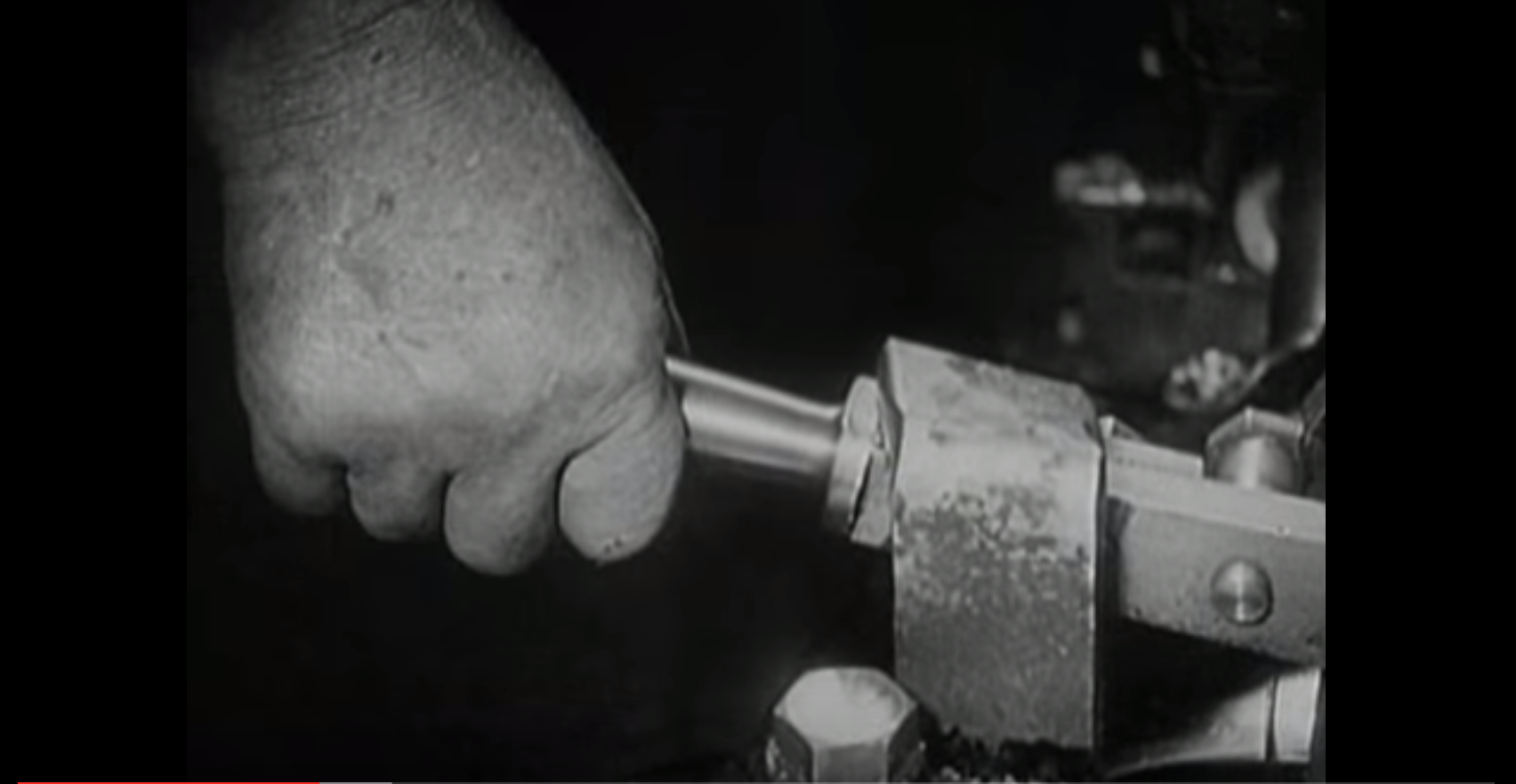 A disembodied hand pushes down on a lever that sets factory machinery into motion in Walter Ruttman's Berlin: Symphony of a Great City.