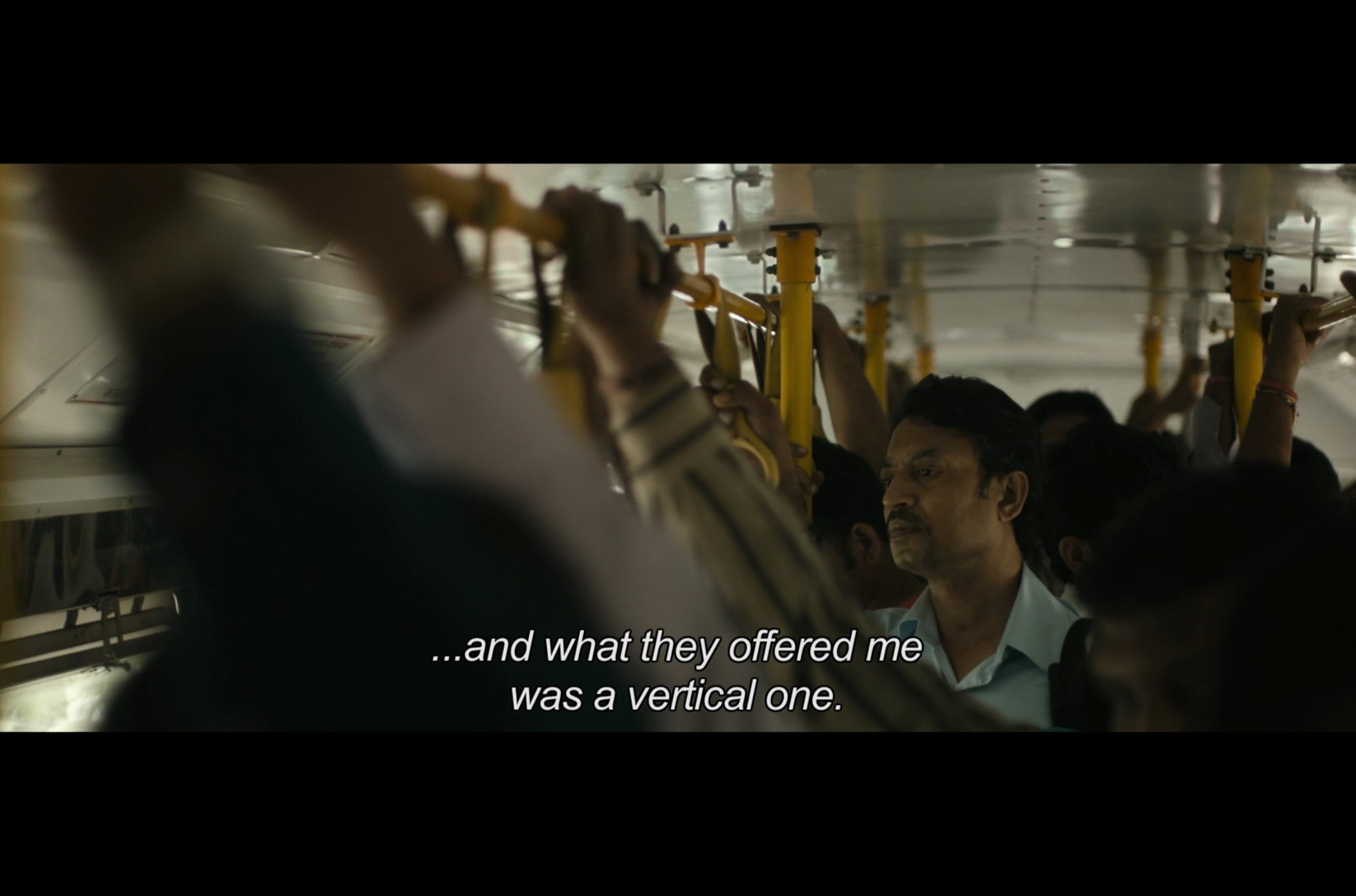 On a Mumbai Bus, Saajan explains that when he went to purchase his own burial plot, he was offered a vertical coffin instead of a horizontal one. His standing position in the bus, packed in with crowds of anonymous strangers mirrors his description of his fate after death.