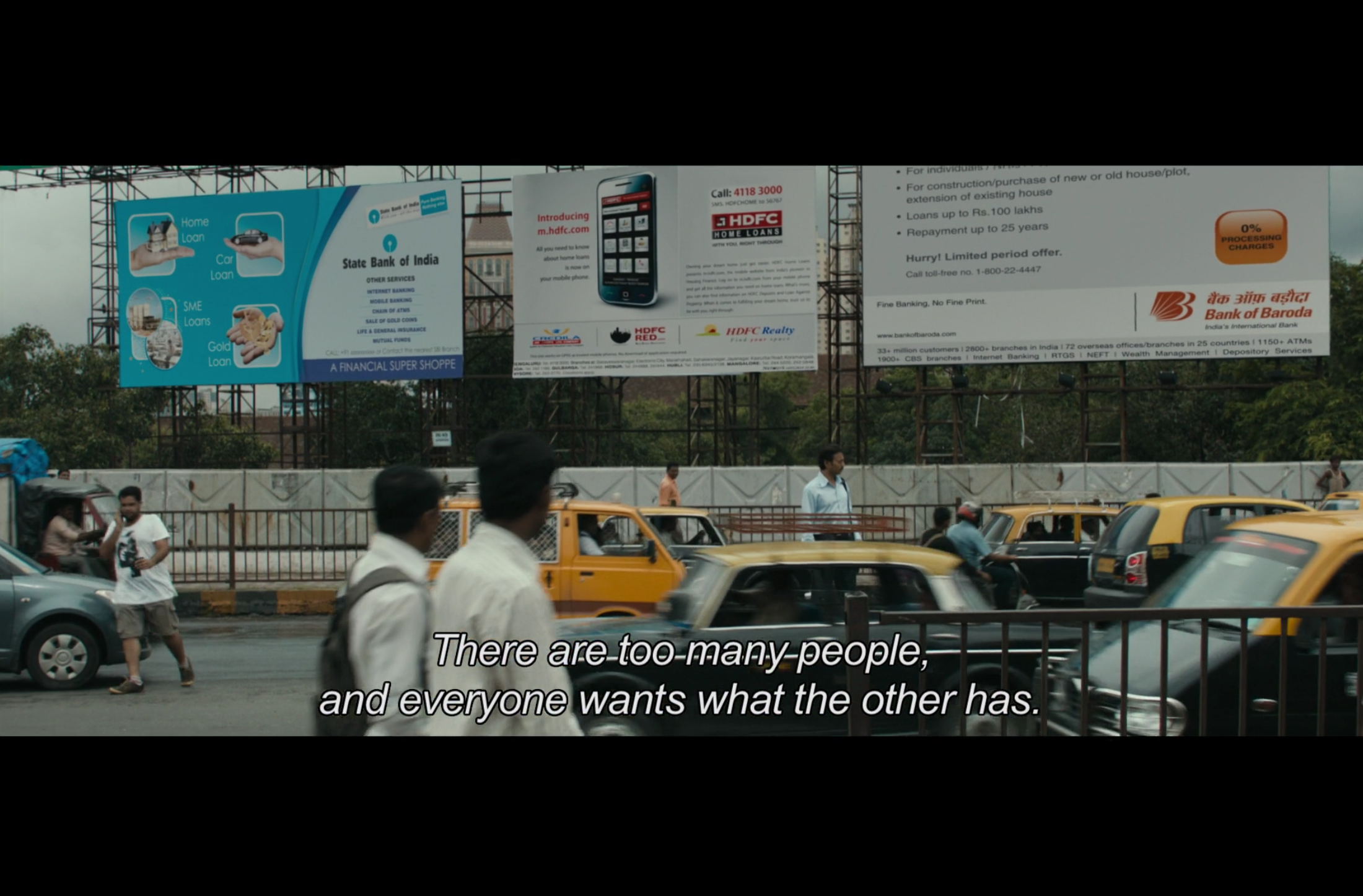 Saajanstands amidst traffic in front of billboards saturated will loan ads.