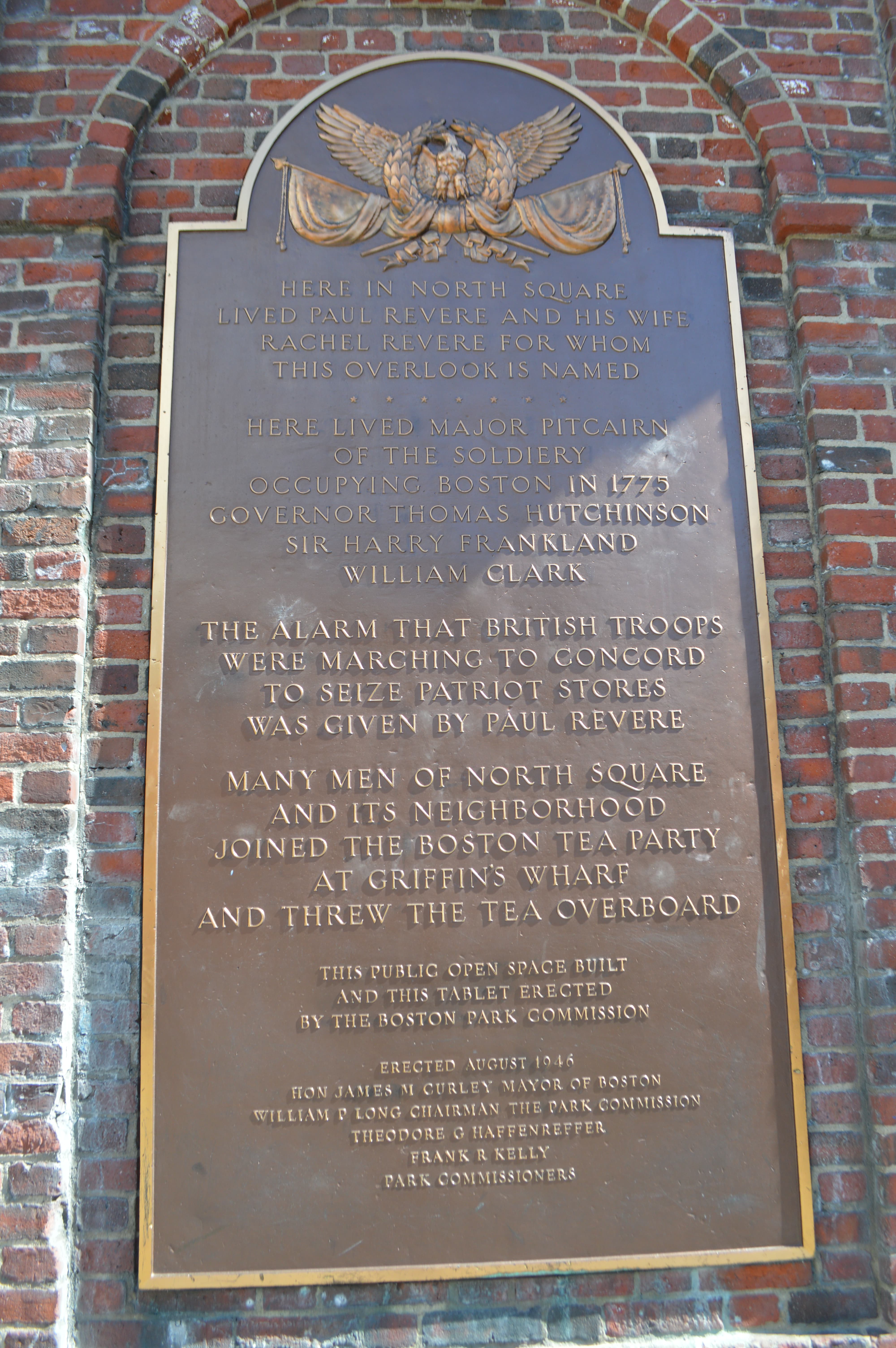 This plaque honoring Paul Revere was hung in 1946 by the Boston Park Commission in North Square, right in front of the Revere House.