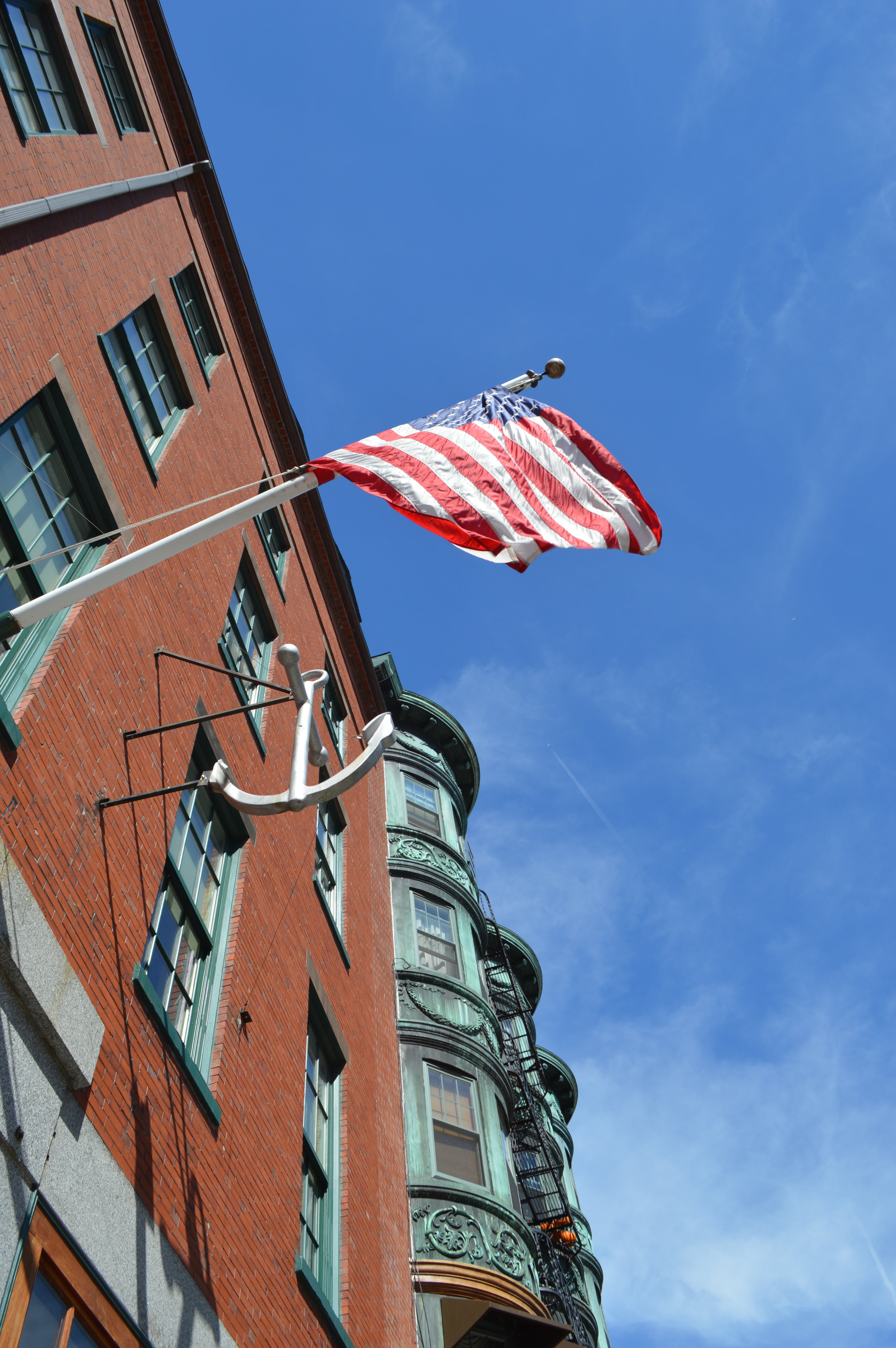 American flag hanging from one of the buildings nearby the Revere House, reminiscing of the Revolutionary times.
