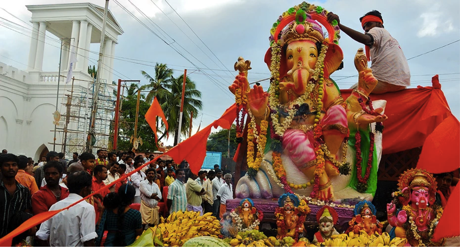 Photograph showing the celebration of the Ganesh Chaturthi festival, centered around the figure of the Hindu elephant-headed god Ganesh, Mumbai's favorite deity.