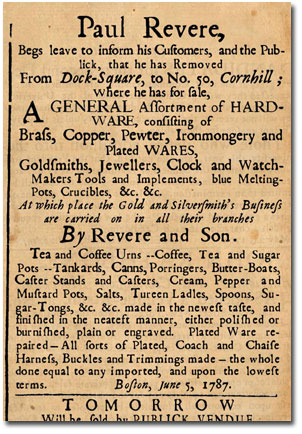 This ad promoting Revere's hardware items and silver work appeared in the June 6, 1787 issue of the Massachusetts Centinel.