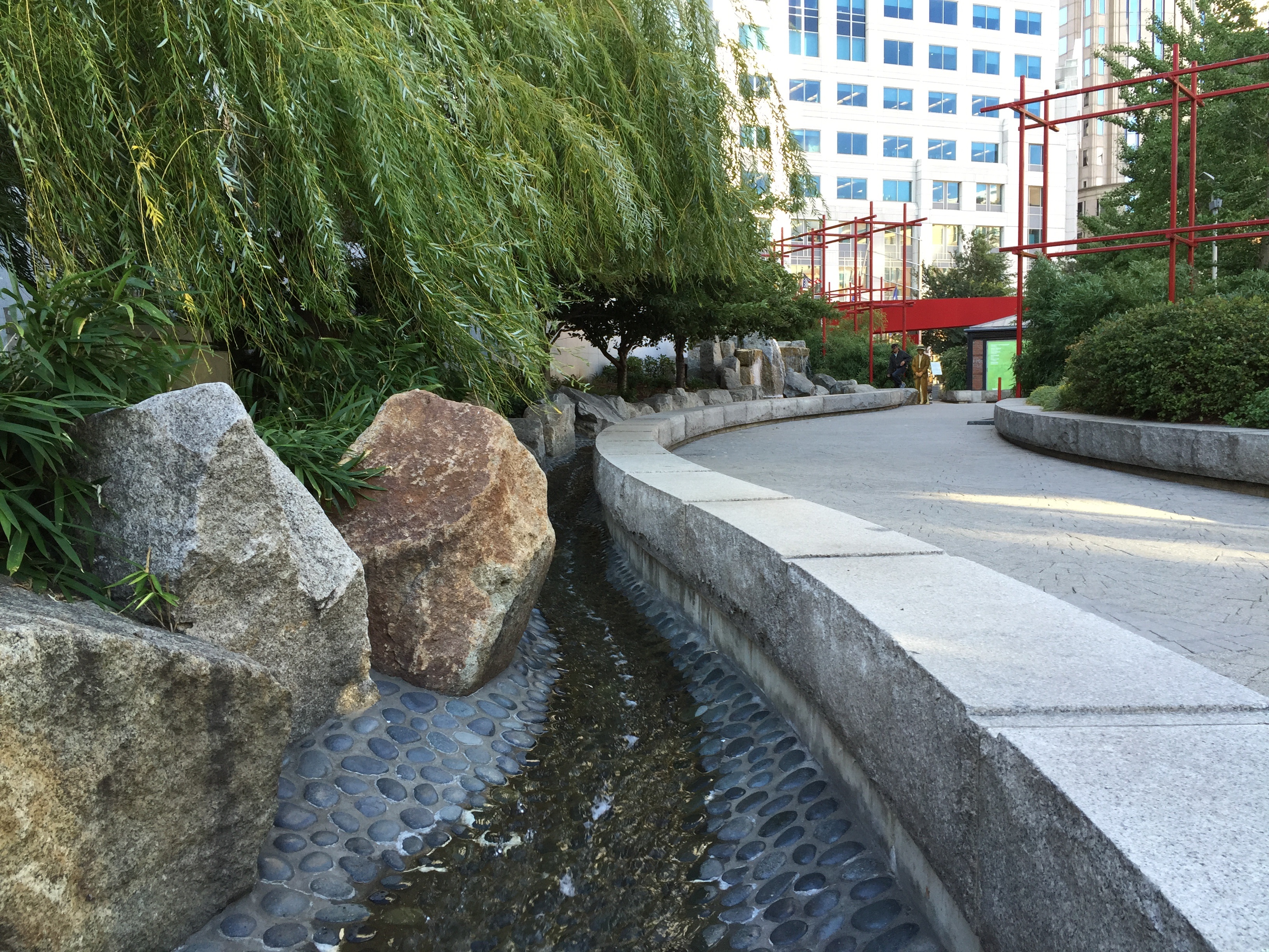 A short distance from the commotion surrounding the Paifang, play area, and game tables is a less-traveled winding walk besides lush vegetation and a running stream.