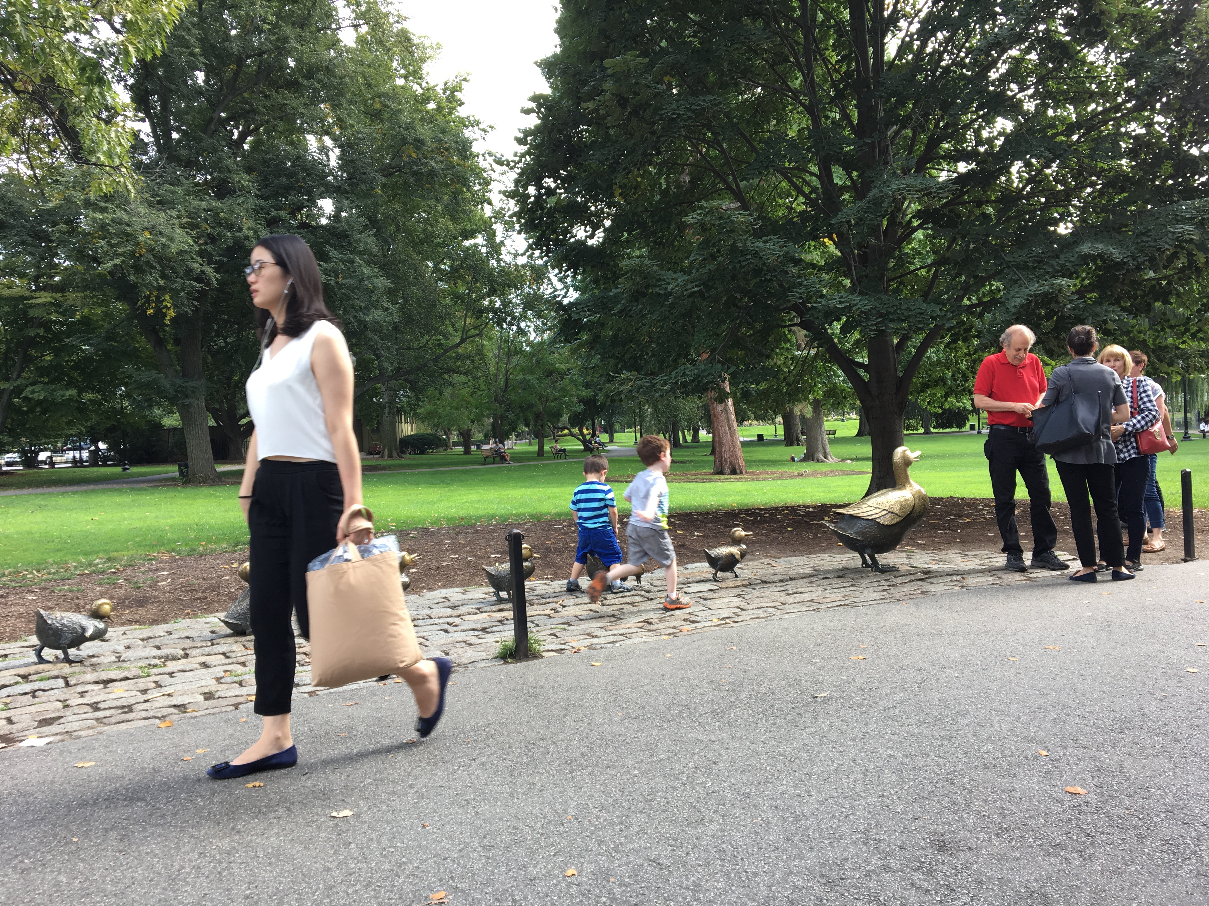 This photograph illustrates the many ways people interact with the ducklings sculptures—ignoring them, playing on them, and taking pictures of them