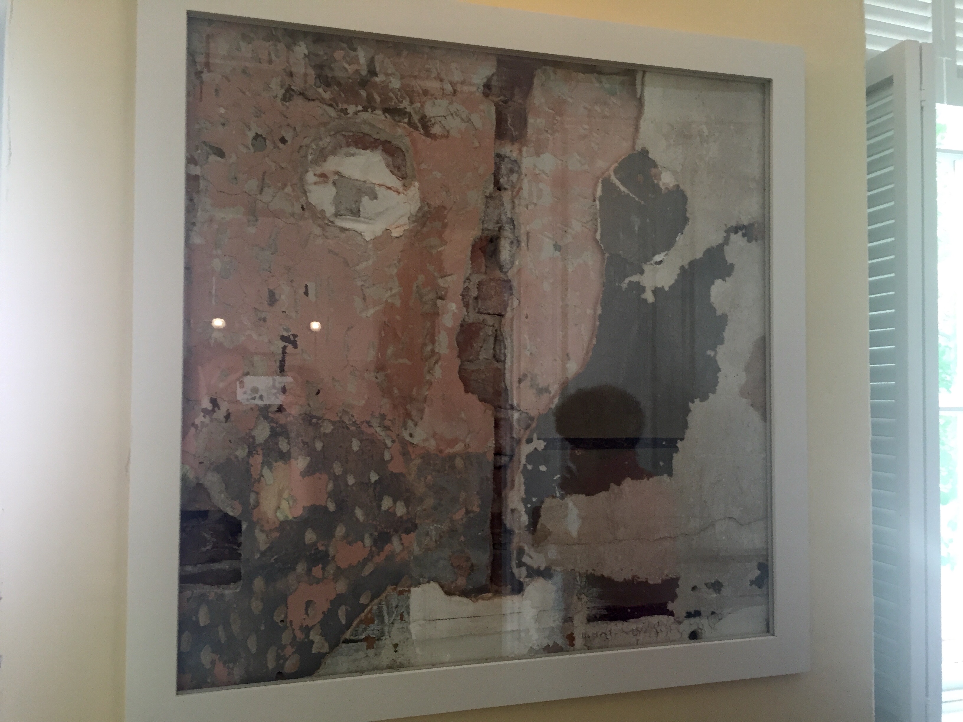 The frame, almost resembling a piece of modern art, reveals the underlying layers of brick and paint under the currently recreated walls of the African Meeting House.
