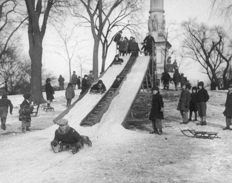 This picture is of children playing in the winter of 1930 around the statue. This picture is a salute to its presence in Boston between its construction and modern day.