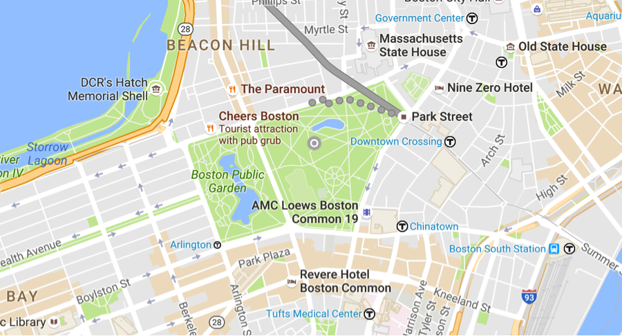 This picture is a map of Boson Commons with the statue in a central position within the park. The Charles River is behind Boston Commons and the state house is also nearby,