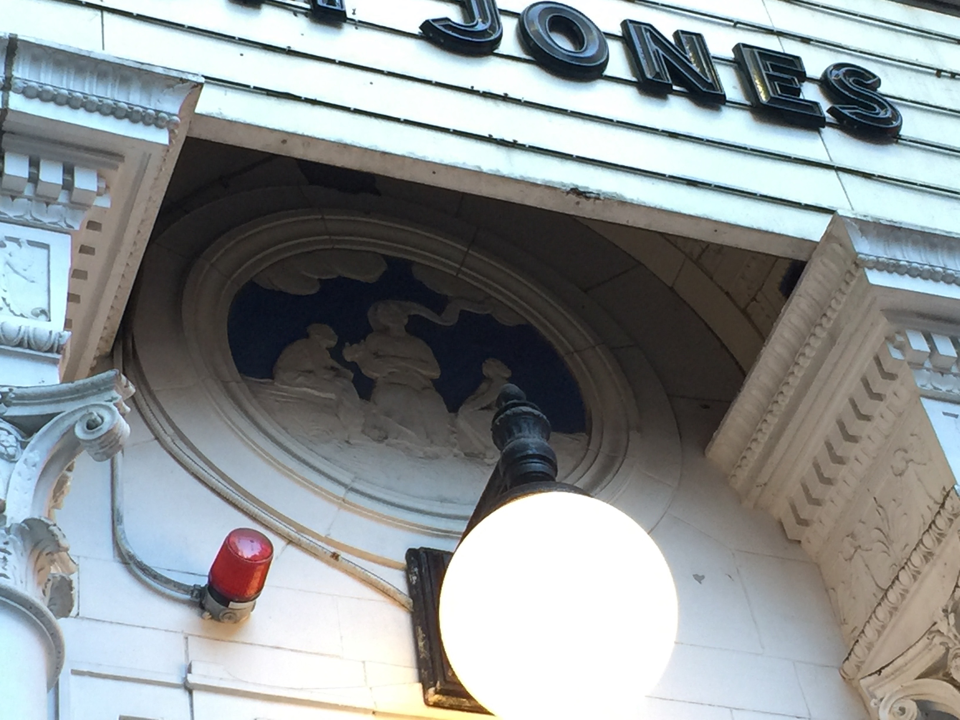 The first artwork piece is of a mother holding a baby and connected to the sky, surrounded by children eagerly listening to her speak. This is most likely a religious reference to the Virgin Mary and Jesus Christ, a tribute to the religiosity of the theatre's founders.
