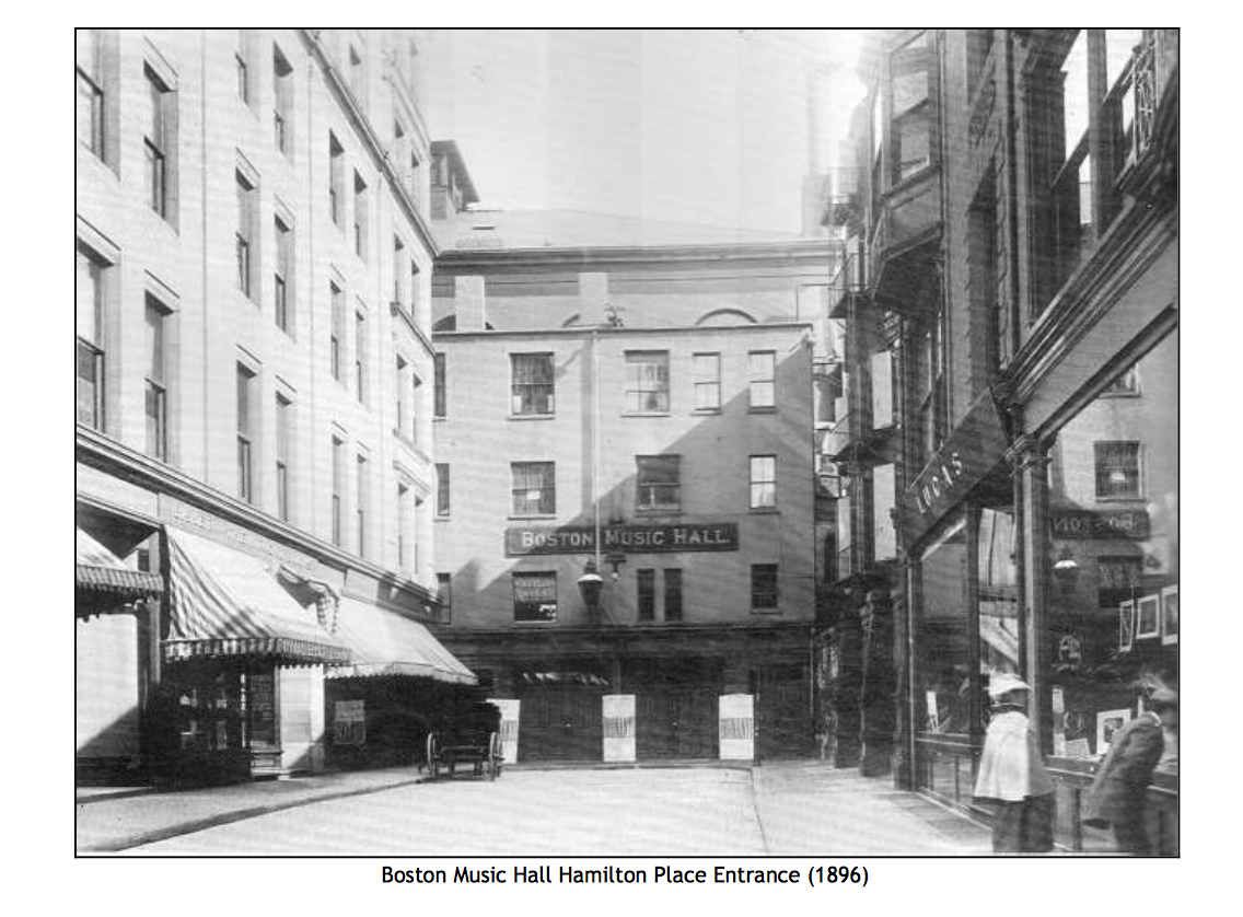 An antique photograph of the back entrance of the Orpheum Theatre (formally known as the Boston Music Hall).
