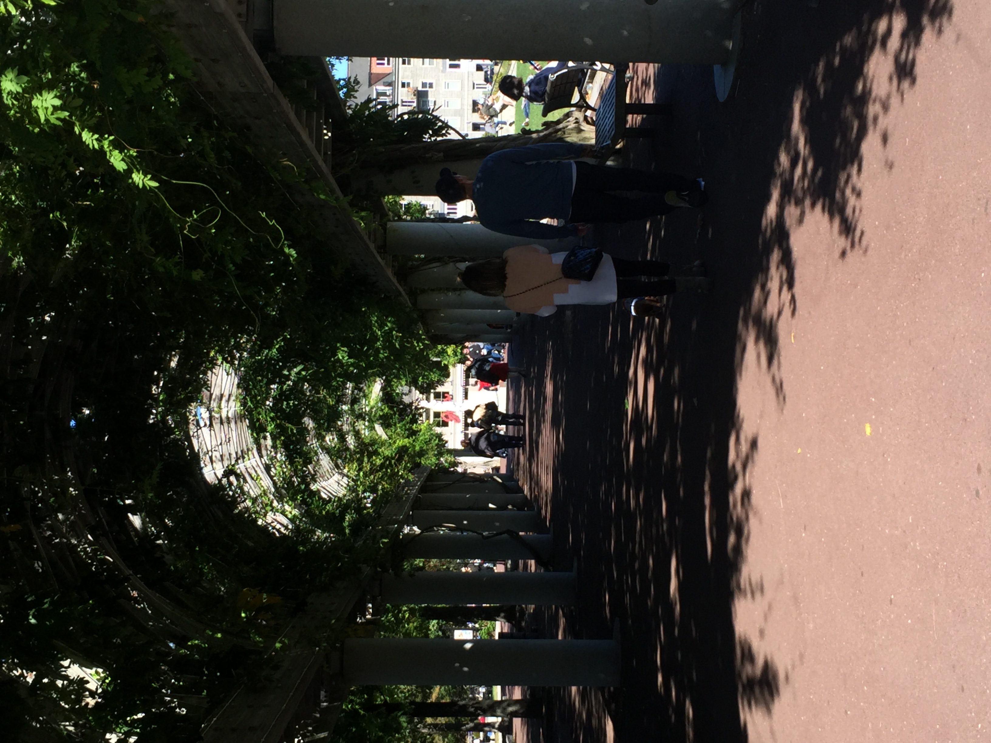 A Statue of Christopher Columbus erected in 1970 centered in the covered portico in the Christopher Columbus Park. Behind it, the "Joe's" sign of the 1960s chain Joe's Restaurant and Grill, which opened this location in 1985, is centered as well in view from the covered walkway.