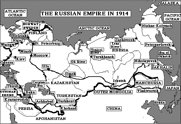 A map of the extent of the Russian Empire as it was in 1914.